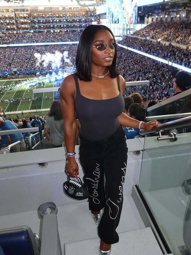 The gymnast lit up the Chicago Bears game with a custom pair of black denim jeans emblazoned in sparkling sequins with her husband Jonathan Owens’ name stitched down each leg. Talk about wearing your heart — and your man — on your sleeve… or in this case, your jeans.